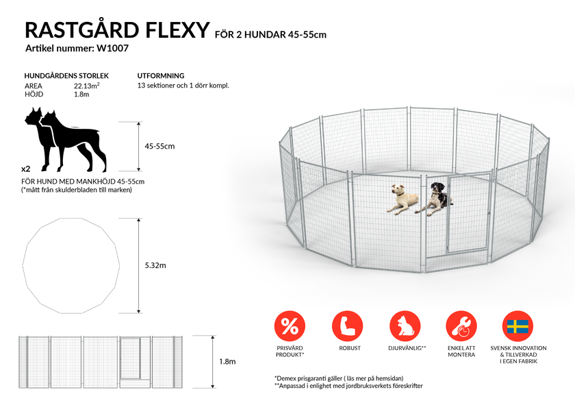 Flexy är den runda modellen i Demex Home-sortimentet och är utvecklad med fokus på hundens trivsel och rörelsefrihet. Den cirkulära formen följer Jordbruksverkets rekommendationer och har visat sig ge en lugnare och mer harmonisk miljö för många hundar. Till skillnad från traditionella, fyrkantiga hundgårdar är Flexy betydligt mer flexibel och lätt att anpassa efter olika tomter och miljöer.