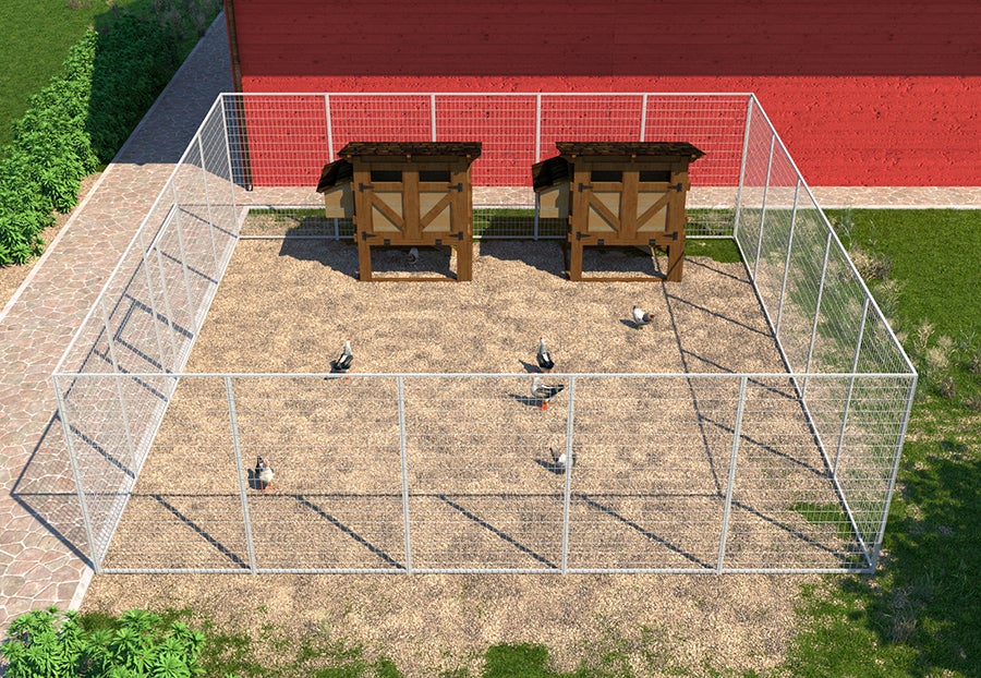 Hönsgårdarna finns i flera storlekar och kan enkelt byggas ut med extra sektioner för att skapa större ytor när flocken växer. Nätet med 100x50 mm maskor och kraftiga 20x20 mm profiler ger god säkerhet och skydd mot rovdjur, samtidigt som det ger hönsen en trygg och rymlig utemiljö.