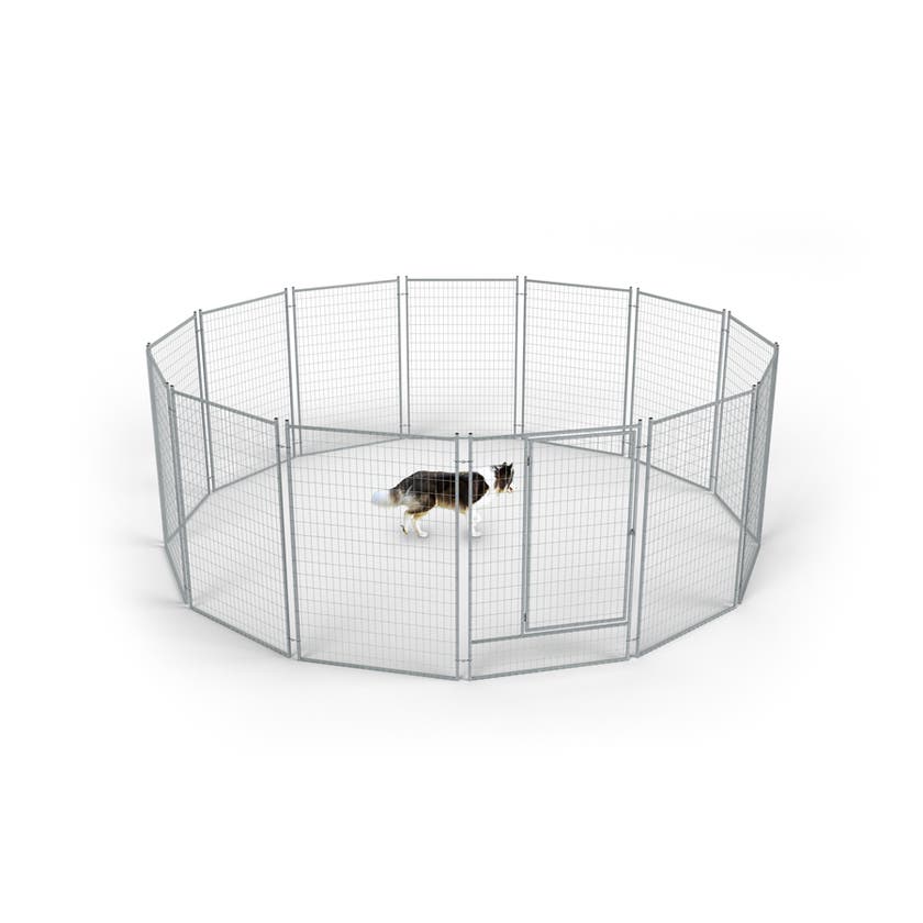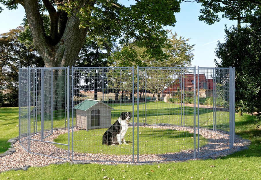Den runda konstruktionen skapar en mjukare yta som uppmuntrar naturlig rörelse, och panelerna är utformade för att göra monteringen snabb och smidig. Flexy fungerar lika bra som permanent rastgård som tillfällig inhägnad när du vill erbjuda hunden en trygg, öppen och trivsam plats att vara på.